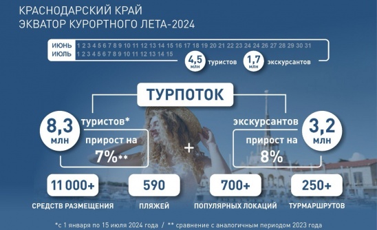 На курортах Краснодарского края к экватору лета отдохнули 8,3 млн туристов
